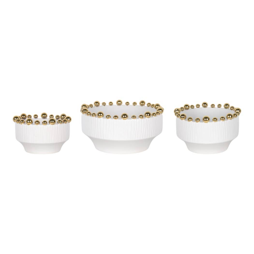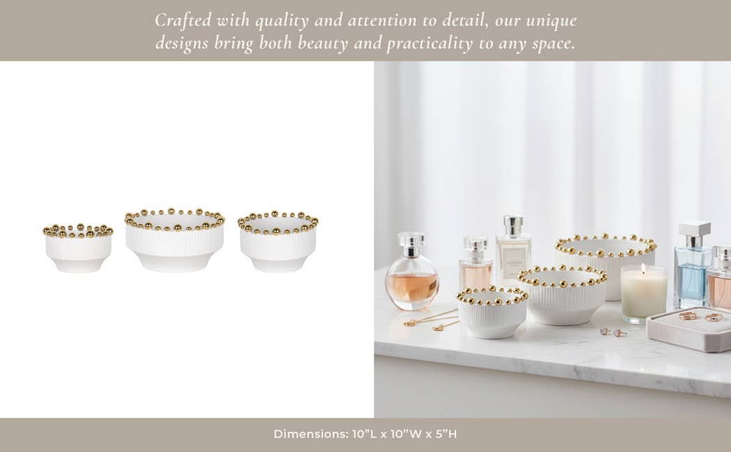 • Three Piece Coordinated Set - Includes 3 bowls for flexible table arrangements or layered decorative displays; dimensions clearly listed - 7"L x 7"W x 4"H, 8"L x 8"W x 5"H, and 10"L x 10"W x 5"H in white and gold.