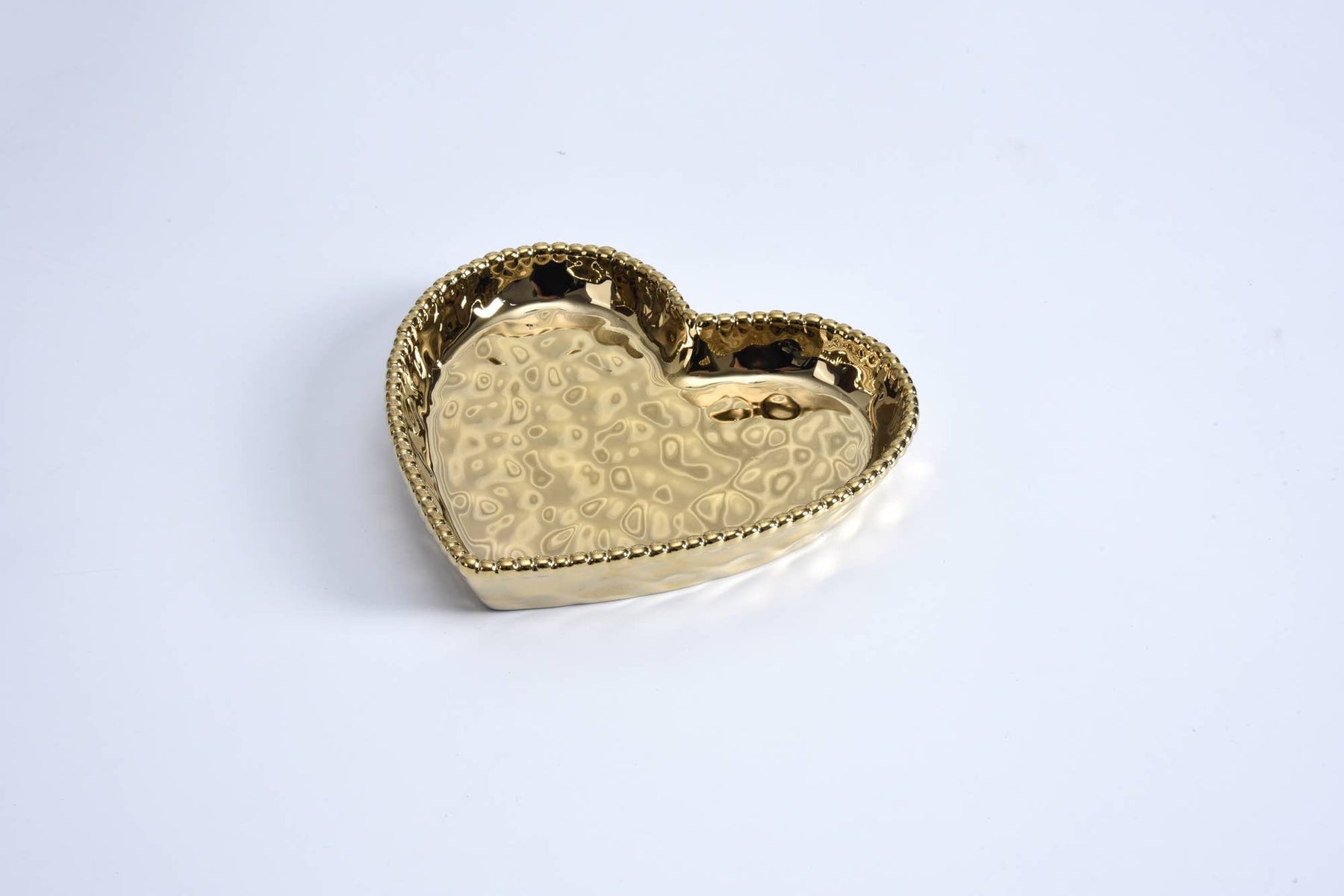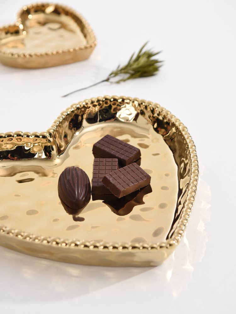 Heart Dish Gold from our Love is in the Air collection. Amazing shape and size to serve your favorite candies or mints and great accent for night side tables, dressers and vanities. This heart dish would make a great Valentine’s Day, Mother’s Day or birthday gift! Show someone you “heart” them with this delightful dish. Crafted in stunning gold titanium finish with lustrous beads. Food safe, dishwasher safe, oven safe to 550°. Easy Care.